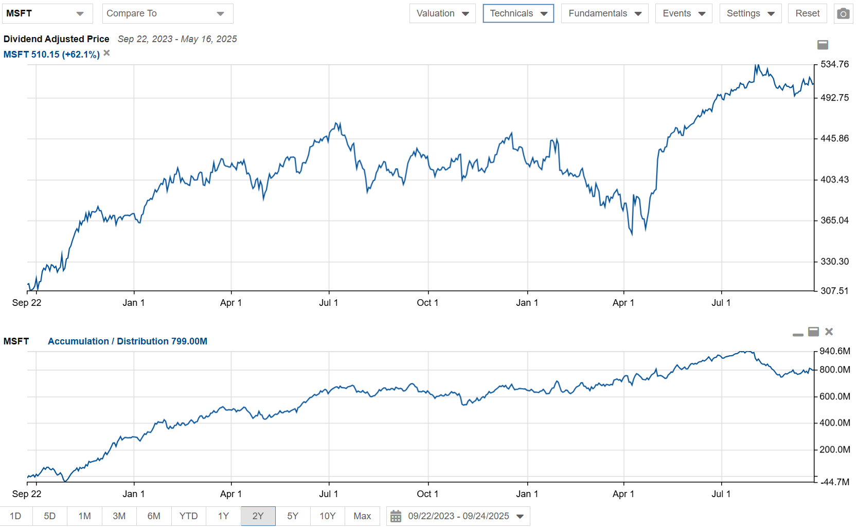 The Accumulation Distribution chart for the last two years for Microsoft is shown below.