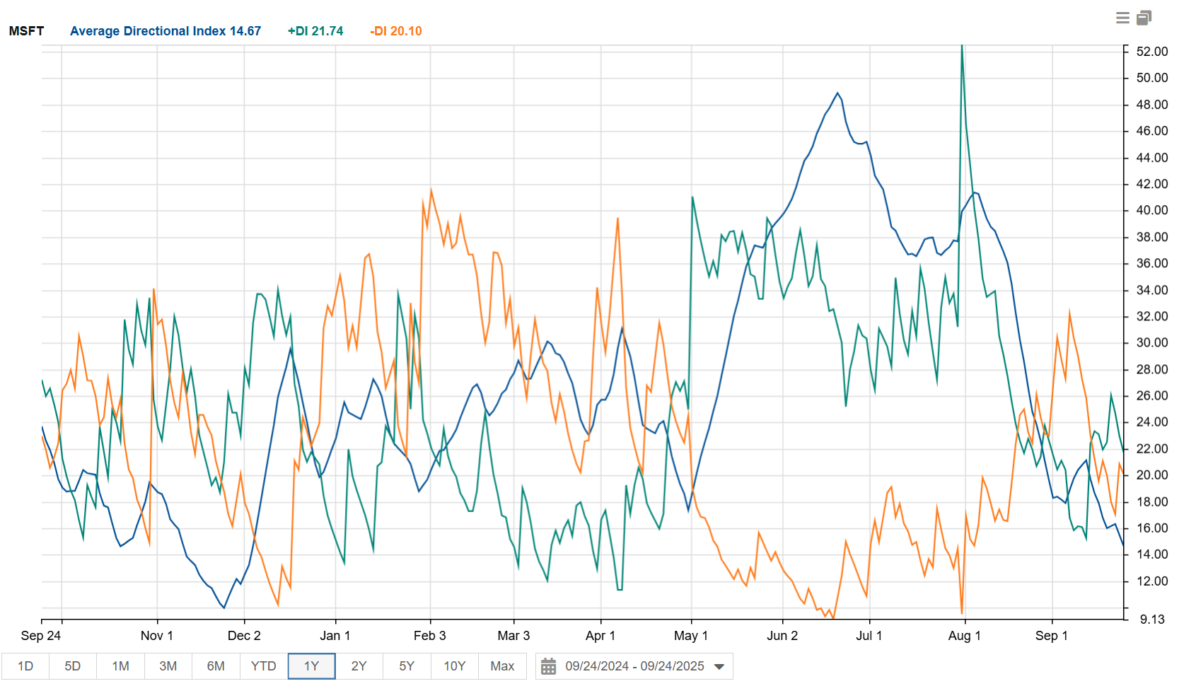 The Average Directional Index chart for Microsoft for the last year is shown below.