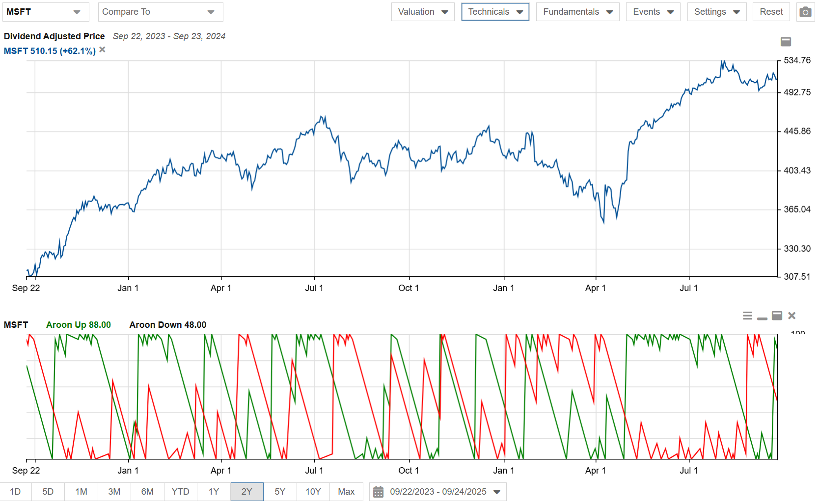 The period is settable, Stock Rover uses 25 days by default. A 25 day period is what was used for the two year Aroon Oscillator chart for Microsoft, shown below.