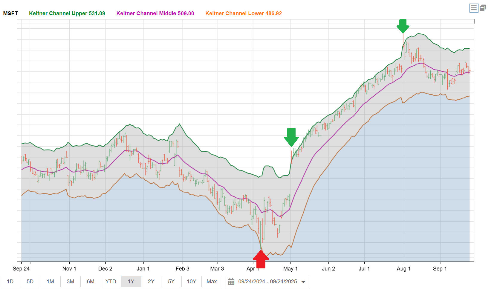 The Keltner Channel Chart for Microsoft for the last year is shown below.