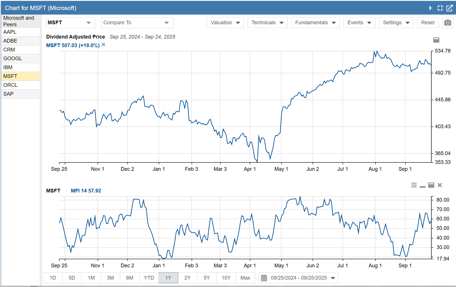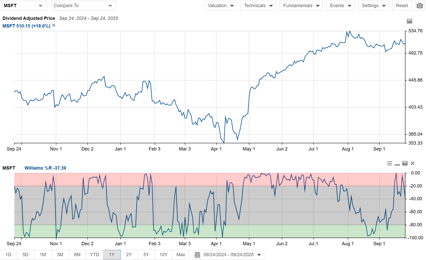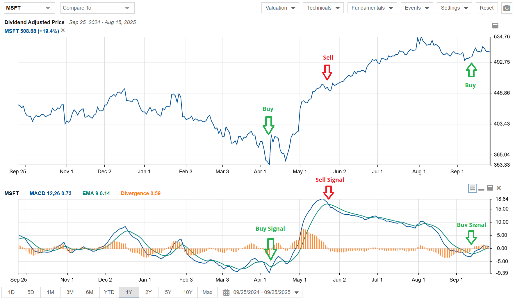 The MACD chart for Microsoft has a number of signal line crosses in the one year period. I’ve highlighted three such crosses, a buy signal in the first week of April 2025, a sell signal near the end of May and another buy signal in mid-September. The first highlighted buy signal was great.