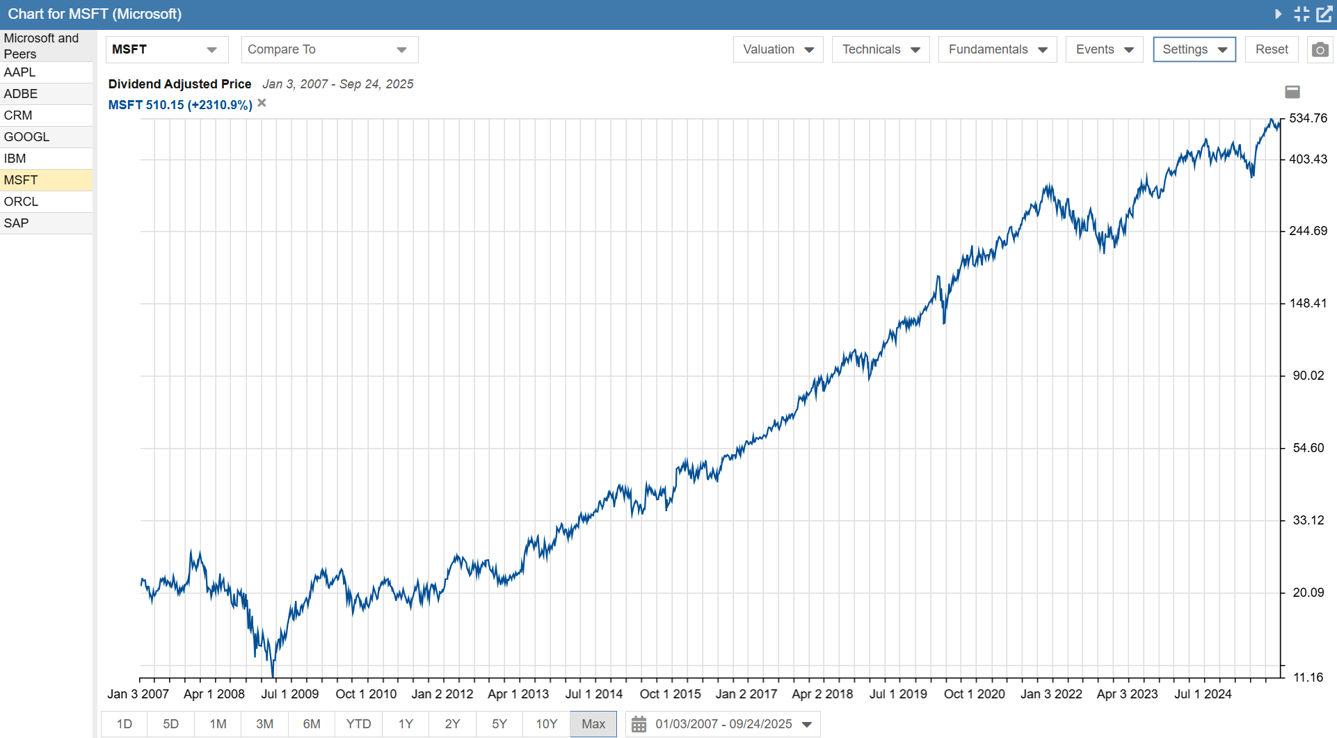 When you look at this chart, it seems Microsoft, the stock, did basically nothing from 2007 to 2013, then started to slowly rise in 2014. If you read Part 2 of this blog series, you would correlate that with the arrival of the new, and still current CEO, Satya Nadella. Then around 2016, the stock’s move upward dramatically accelerated, a trend that continues (with a few bumps) to the day of this writing.