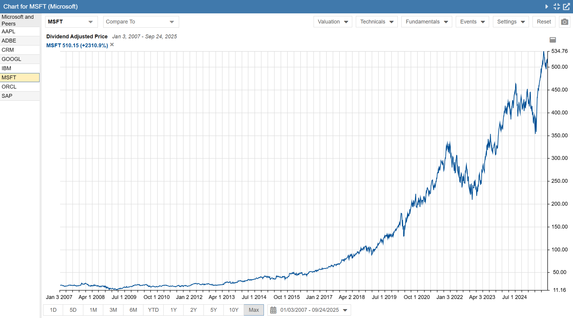 When examining the performance of a stock, ETF or fund, I like to begin with the basic price chart, set to the maximum date range, which is over 18 years. Here is Microsoft’s chart.
