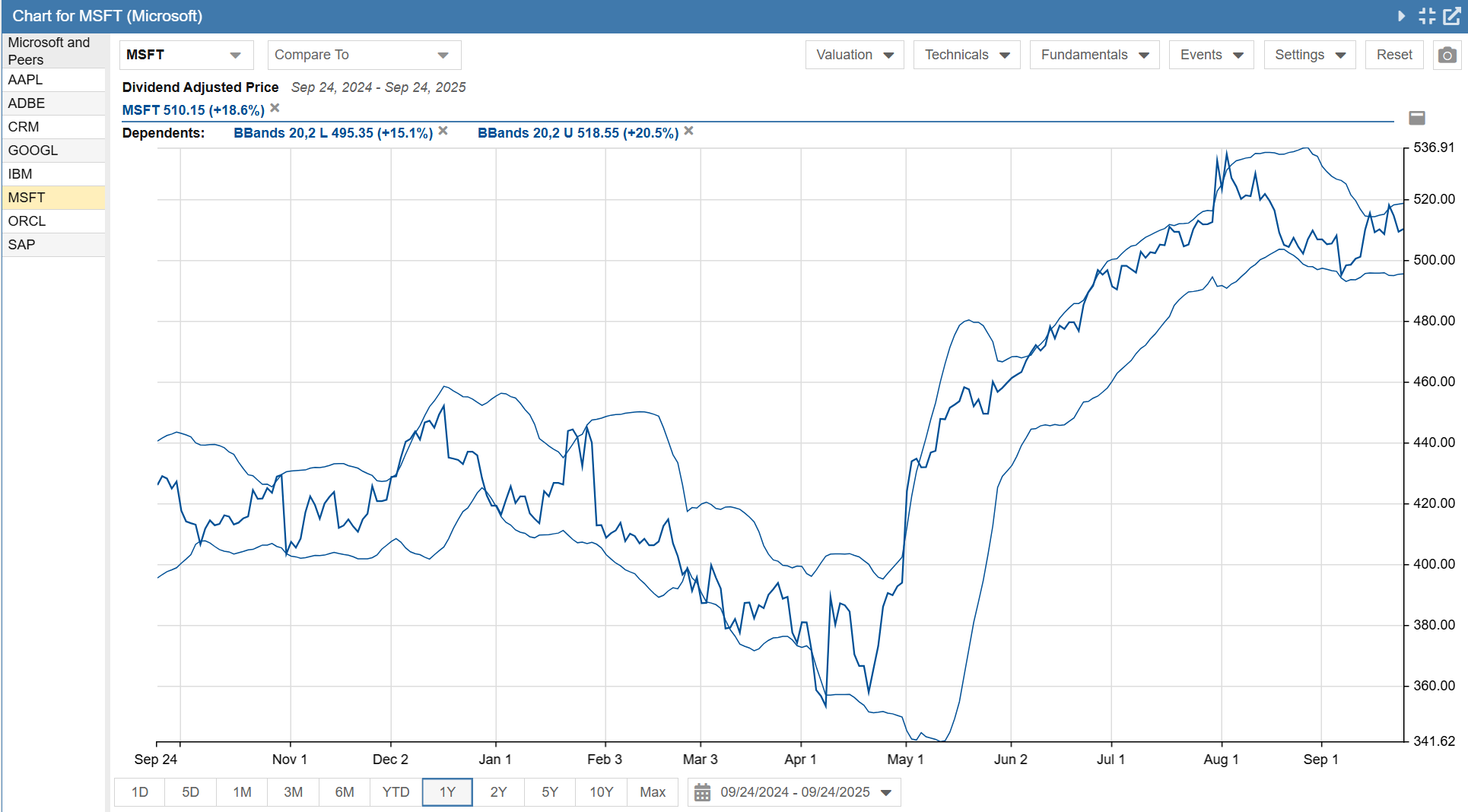 However, if the overall trend of the bands is down, as it has been from September 2024 to April of 2025 for Microsoft, then even if the stock is close to the lower band (oversold), it is still not a good time to buy.