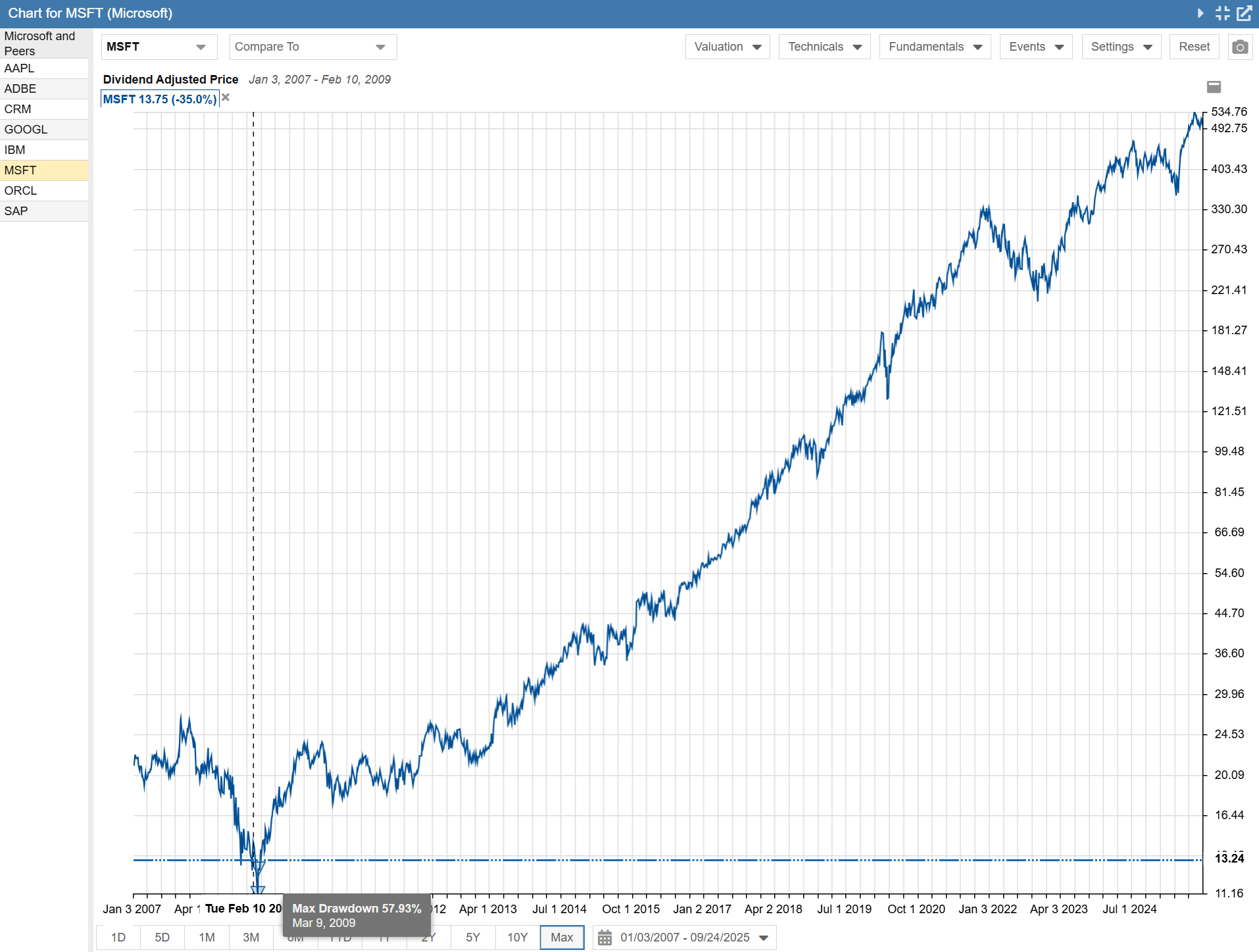 I have created three different price charts for Microsoft to see what the maximum drawdown was in each period.