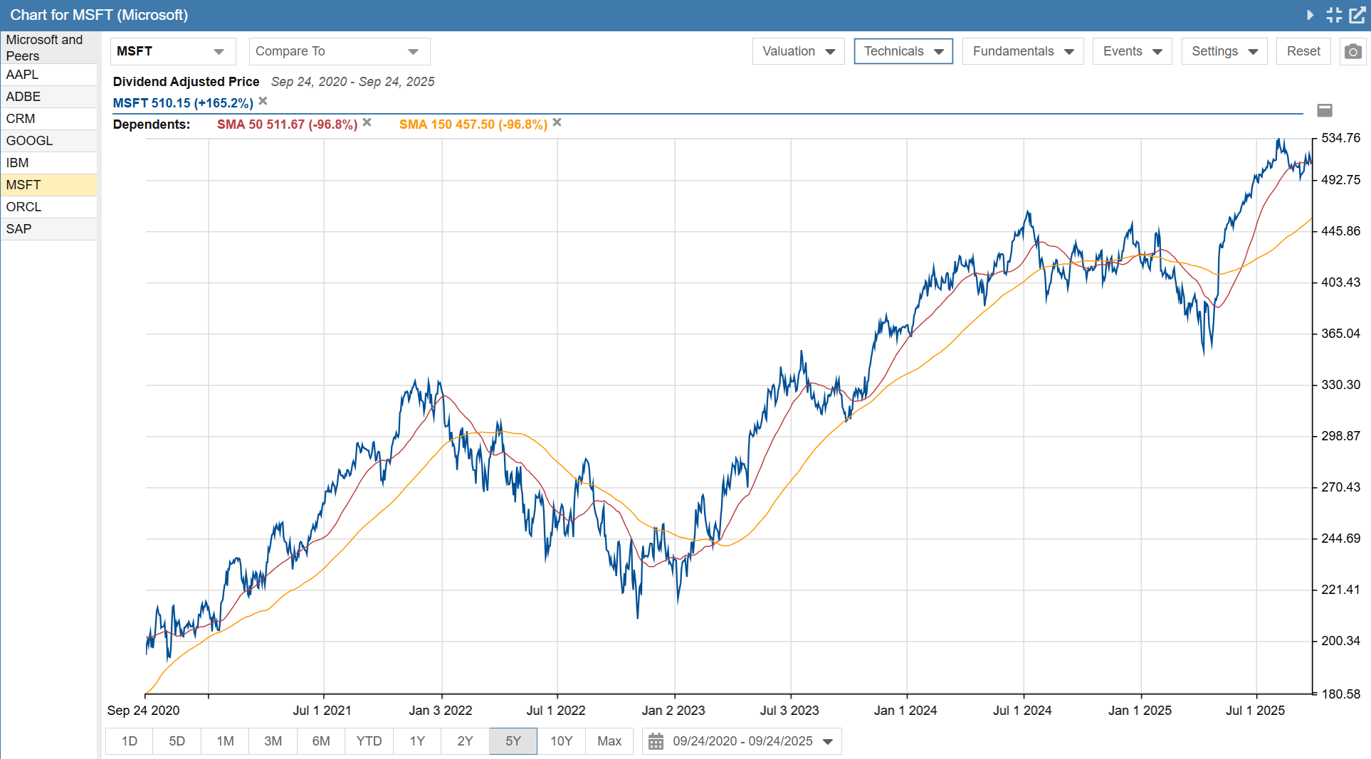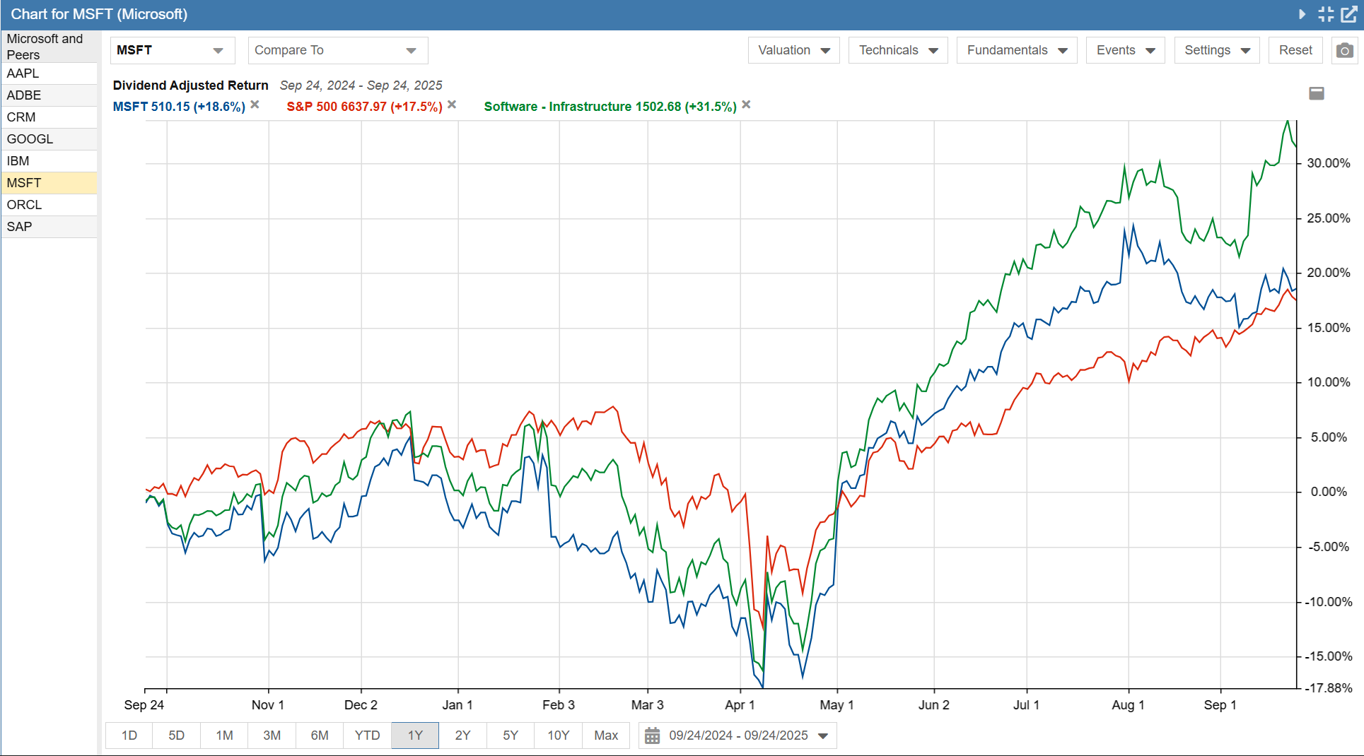 The chart tells us that for the first 6 month of the prior year, the software industry and Microsoft both underperformed the S&P 500. Everything turned around at the beginning of April 2025, where both the software industry and Microsoft outperformed the S&P 500. However, it is clear that Microsoft is underperforming its own industry by a lot.