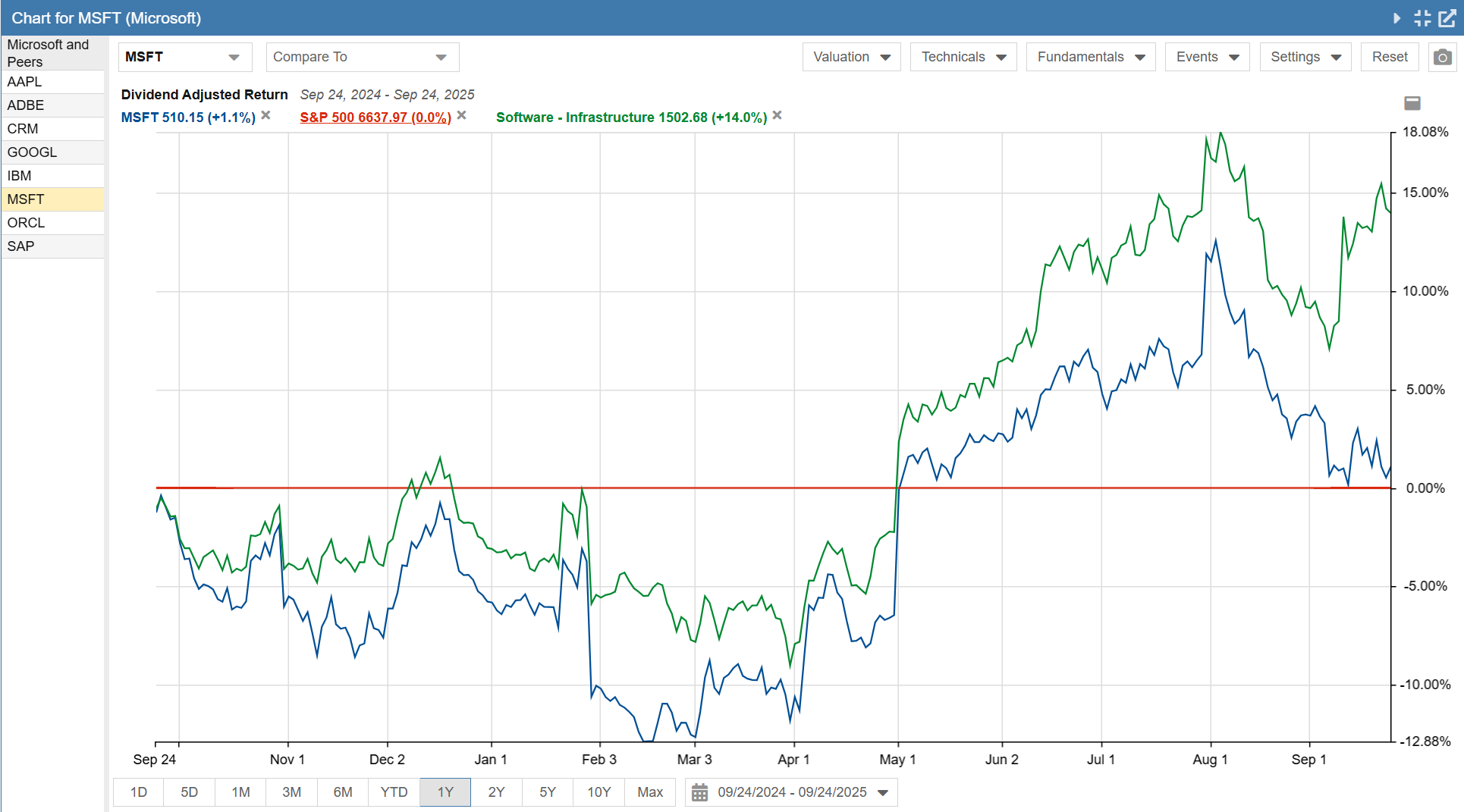 Let’s redo the chart, setting the S&P 500 as a baseline to see this more clearly. In the chart below, the performance of Microsoft’s stock and the software infrastructure industry are charted vs. the S&P 500.