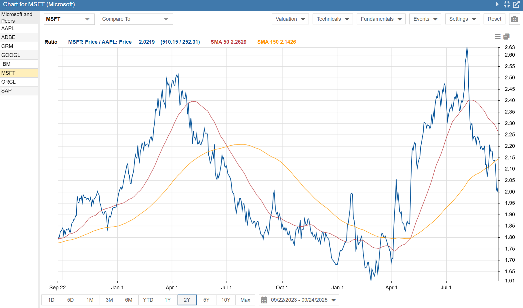Since Microsoft is in the numerator of the ratio, an ascending line means Microsoft is outperforming Apple, and a descending line means Apple is outperforming Microsoft.