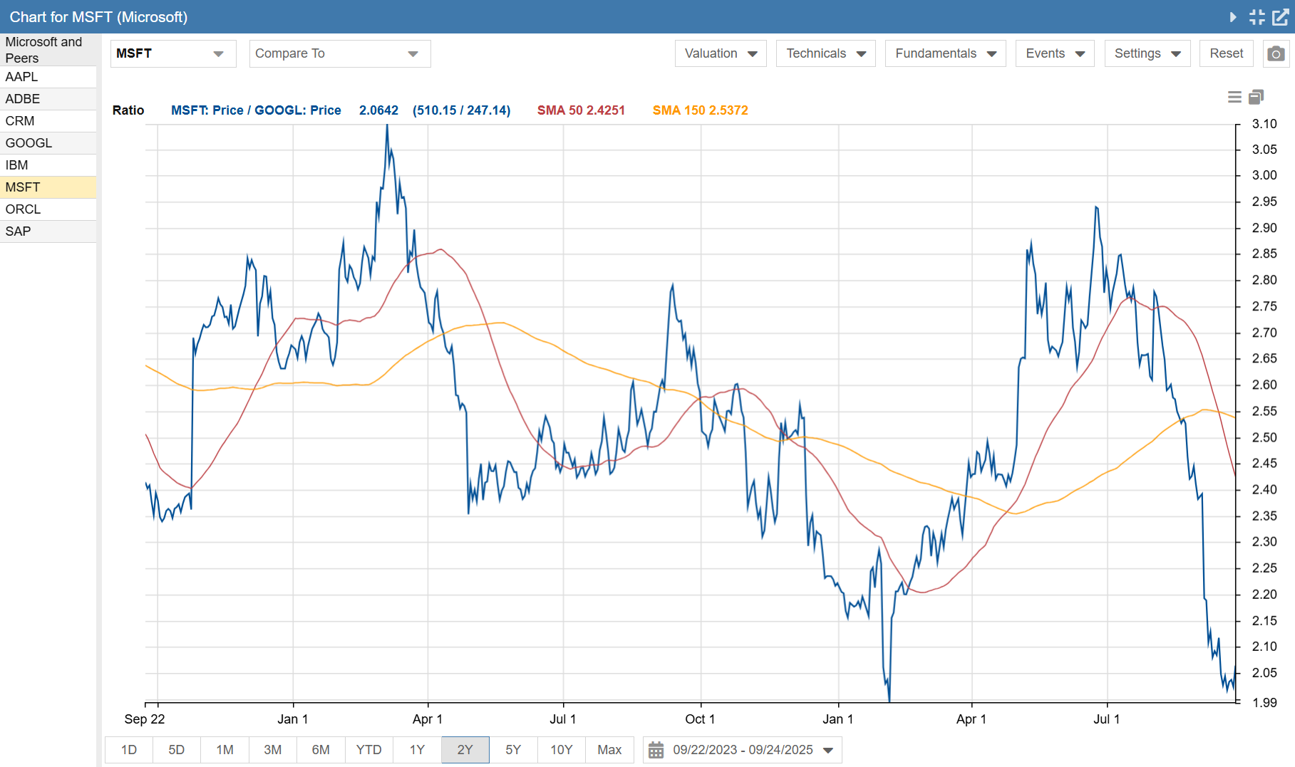 Now take a look at Microsoft vs. Google over the last two years. Again Microsoft is in the numerator of the ratio, and again an ascending line means Microsoft is outperforming Google, and a descending line means the opposite.