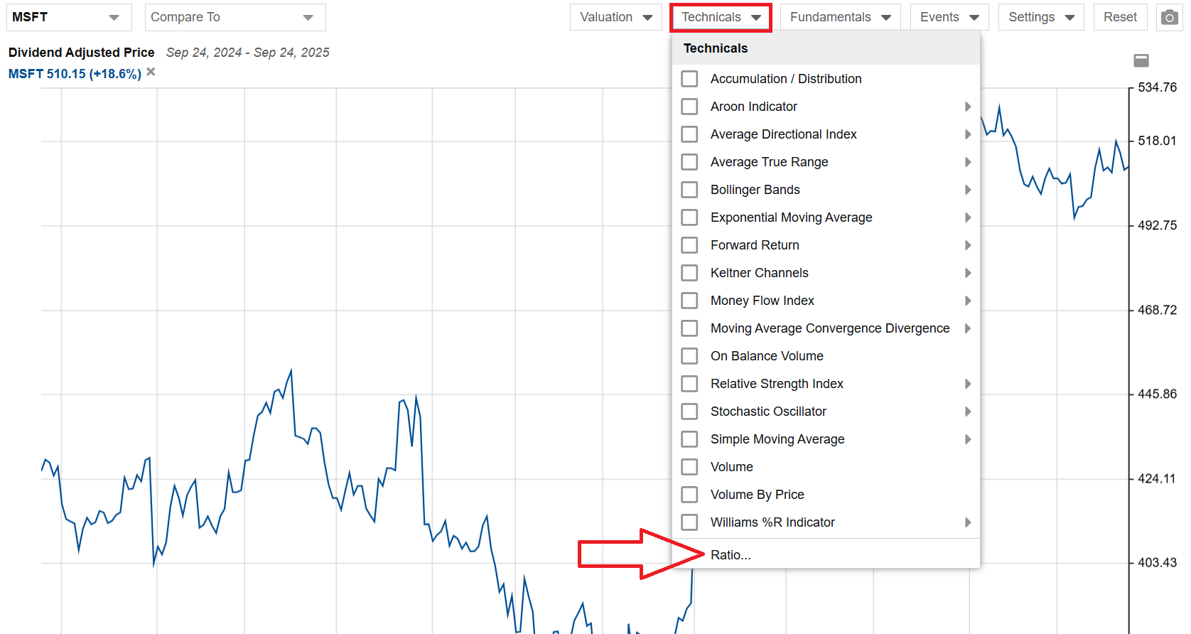 Ratio Charts are found at the bottom of the Technical Charts dropdown menu as shown below