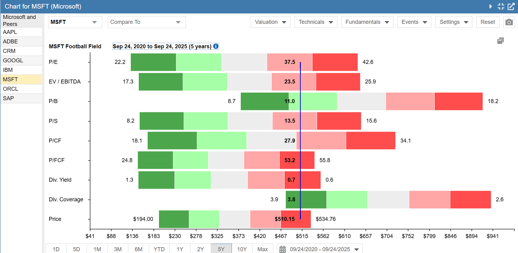 Below is a screenshot of the Football Field chart for Microsoft covering the last five years. It makes for quite a powerful presentation of valuation data as you can view current valuation metrics (blue vertical line) vs. its five year range.