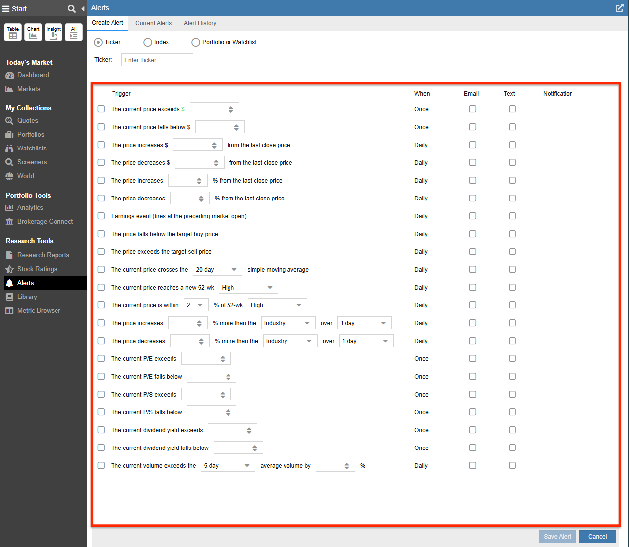 Professional tracking means setting up a system that watches the market for you. Stock Rover allows you to set sophisticated Alerts (via email, text, or notification) that trigger only when specific criteria are met.