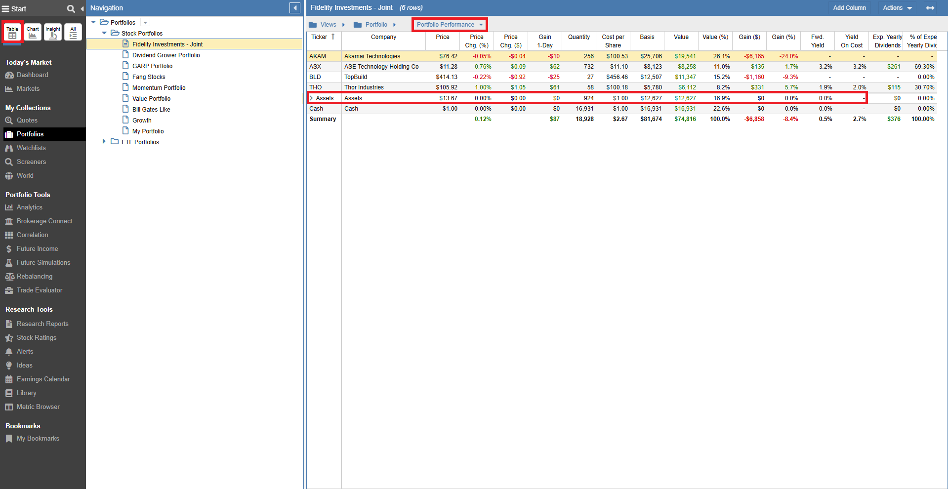 When you load a Portfolio with Assets into the Table, an Asset summary row is displayed at the bottom. The screenshot below shows the portfolio’s positions along with a summary of Assets using the Portfolio Performance View.