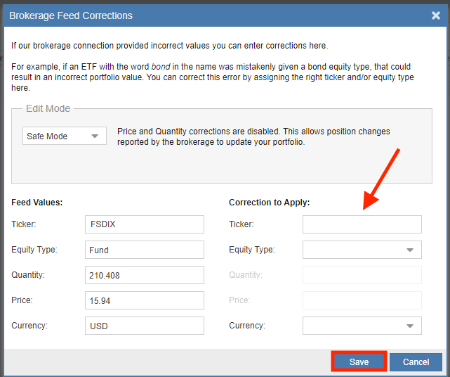 Correcting a misidentified symbol is straightforward. You begin in the Portfolio Manager and choose the appropriate portfolio, and then click on the Positions tab. While in the Corrections column, you will then click on the Edit button that corresponds to the misidentified symbol.