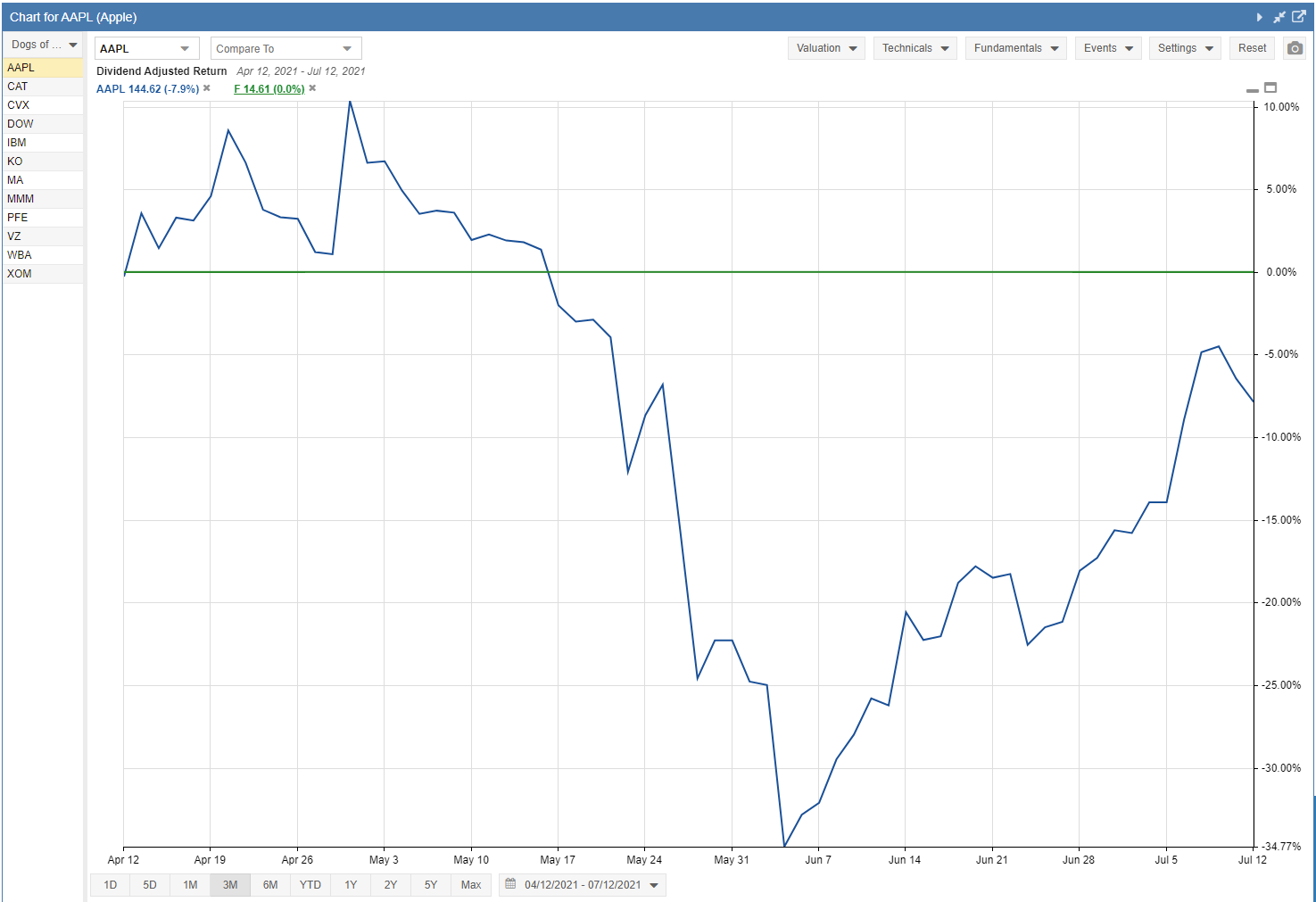 You can set one line in the chart as the baseline by which the others are measured. To do this, click the small graph icon next to the ticker symbol for the stock that you want to use as the baseline (shown in the screenshot below). This “flattens” the line, setting it at 0%, and thus shows the other stocks’ relative performance. The baseline stock will show a flat line in its graph icon, while the others will show squiggly lines in theirs. Any line in the chart can be set as a baseline by clicking on its graph icon—this also means you can switch baselines just by clicking on a different graph icon.